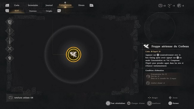 Pour débloquer cette capacité, il vous faudra d’abord améliorer d’autres compétences telles que la concentration, le vol amélioré et la ruée de la corneille. Cette nouvelle capacité permet de traverser rapidement des zones tout en consommant de l’endurance et de l’esprit. Une bonne option pour se déplacer efficacement entre les zones, mais à utiliser avec parcimonie pour éviter de s’épuiser trop rapidement.